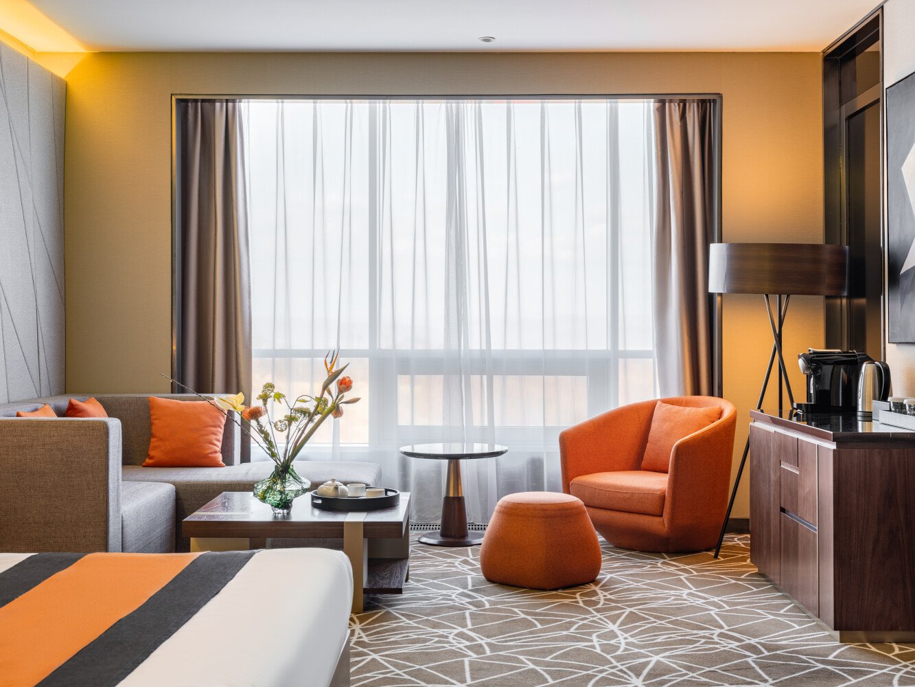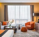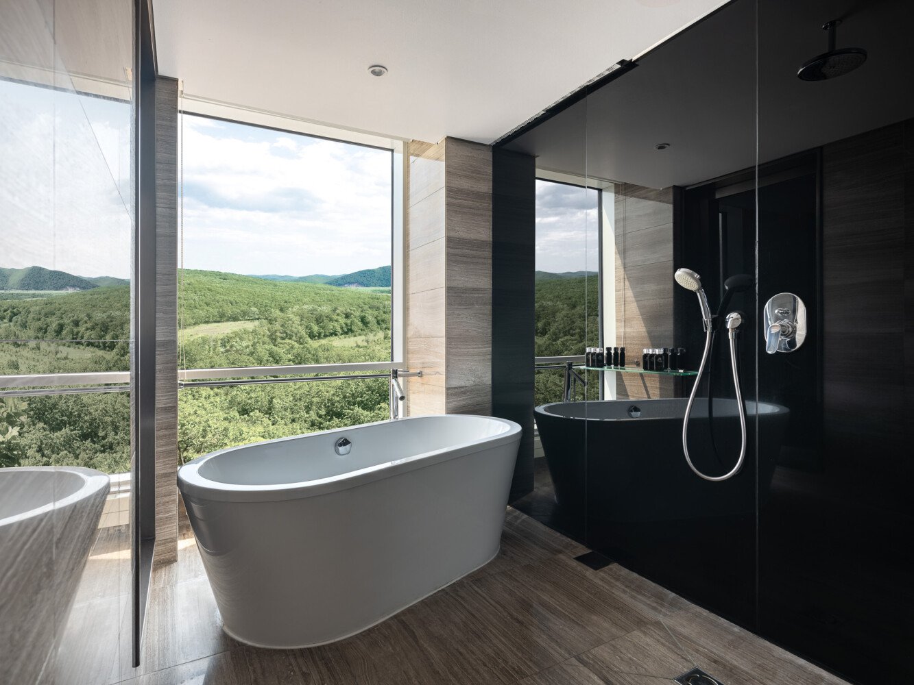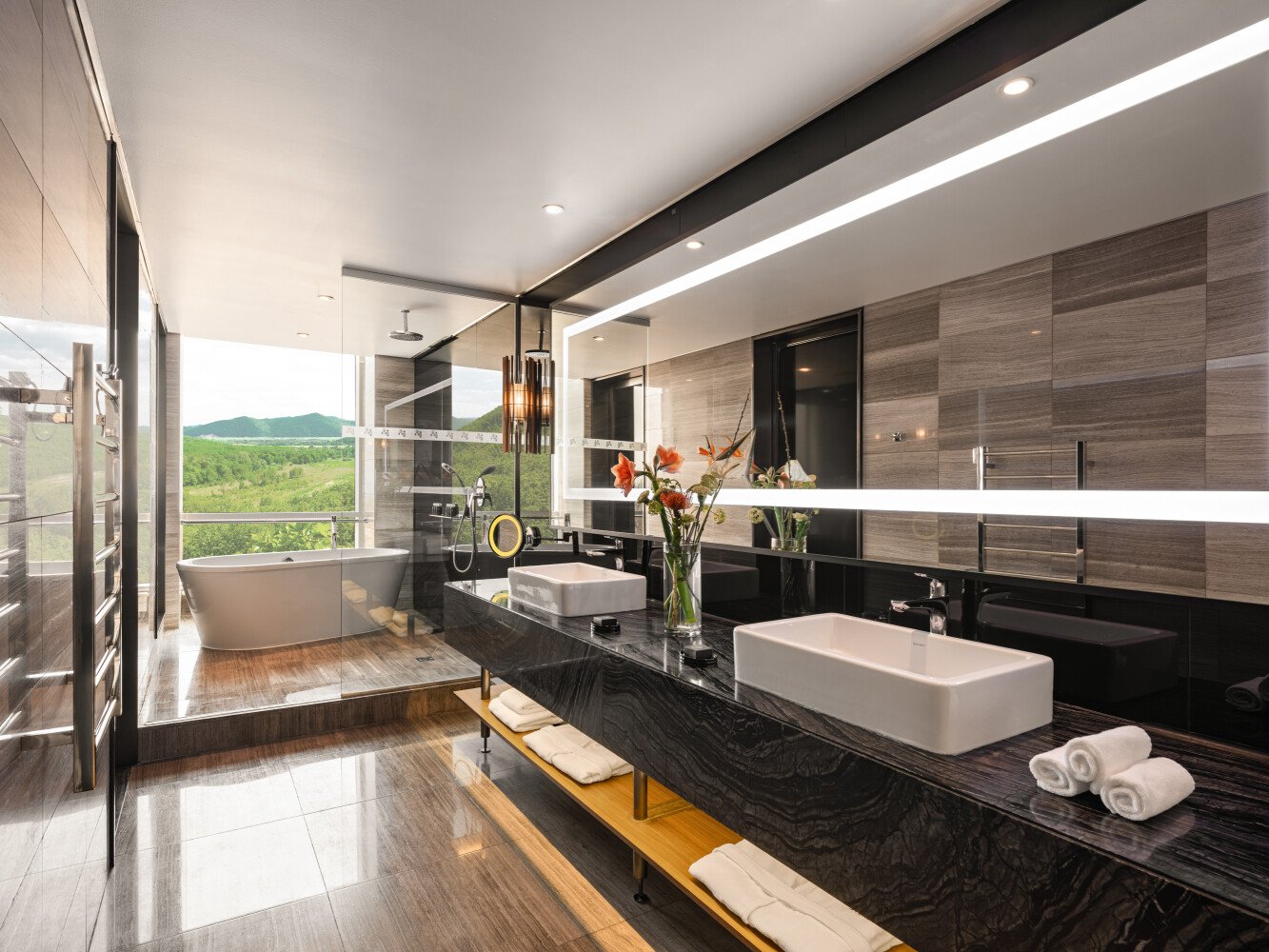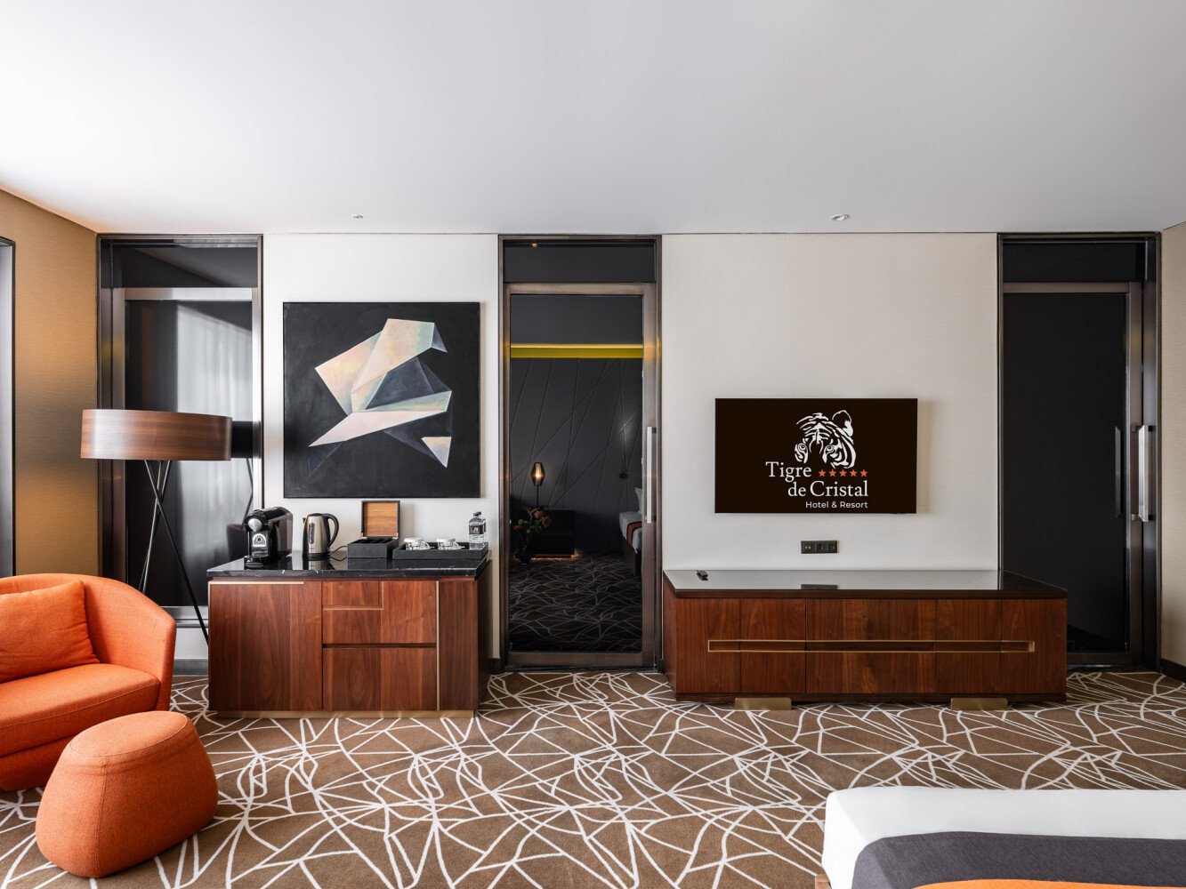 Полулюкс "Джуниор сюит" площадью до 60 м² с дополнительным пространством и мягким угловым диваном идеально подойдёт любителям повышенного комфорта. При желании номера этой категории могут быть объединены, и их общая площадь составит более 100 м². Ванна в ванной комнате расположена напротив панорамного окна, где открывается вид на бухту или горный массив.